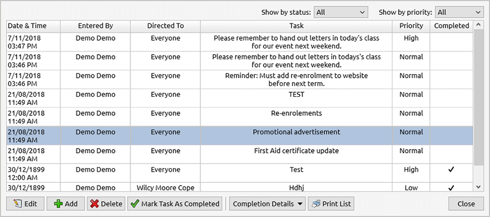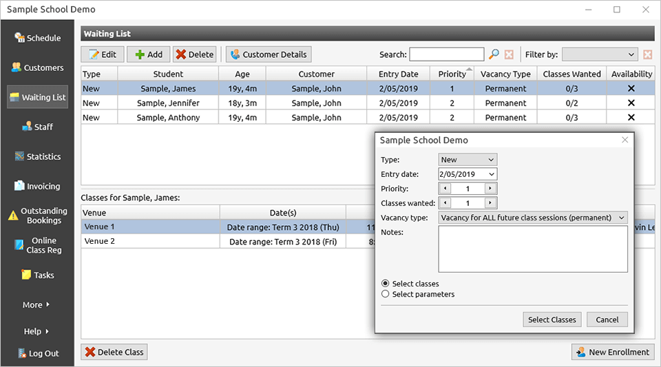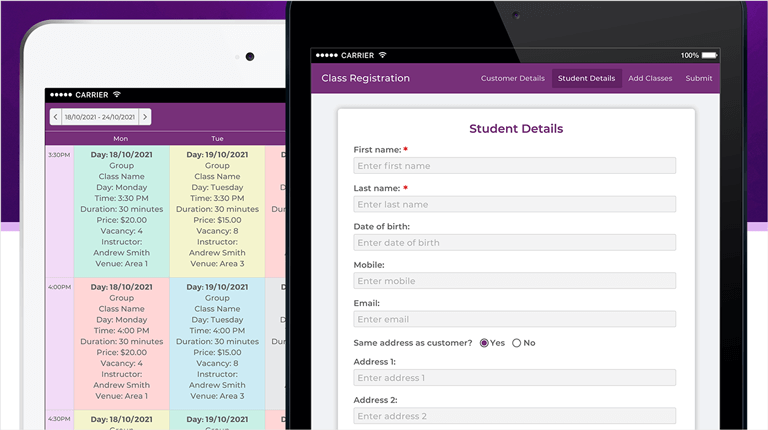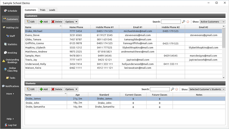 ClassBiz will keep your customer and student details organised. Our intuitive interface enables you and your staff to add and edit customers and students. Both customers and students can be made inactive when they no longer attend classes, keeping their information on file as historical records. Customers can also be divided into categories for easy access.
